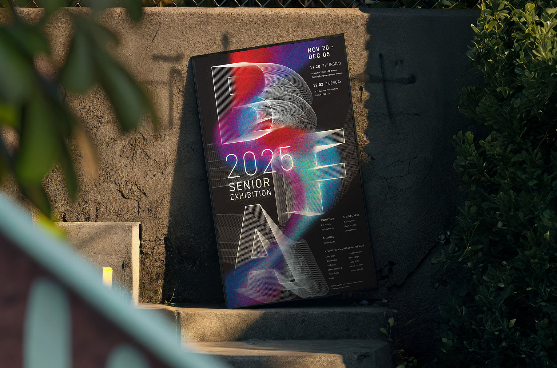 The idea of prism became the guiding creative strategy. A prism displays the essence of multiple light paths coming together and refracting, much like the senior design class. From that notion, the design evolved into a study of light and structure. Wireframe letterforms echo the idea of form taking shape, while layered contour lines and shifting gradients create a sense of movement, as if the poster itself were bending light. The composition balances intensity and order, using typography as both architecture and atmosphere. The result is a visual metaphor for creative expansion, where focus transforms into brilliance.