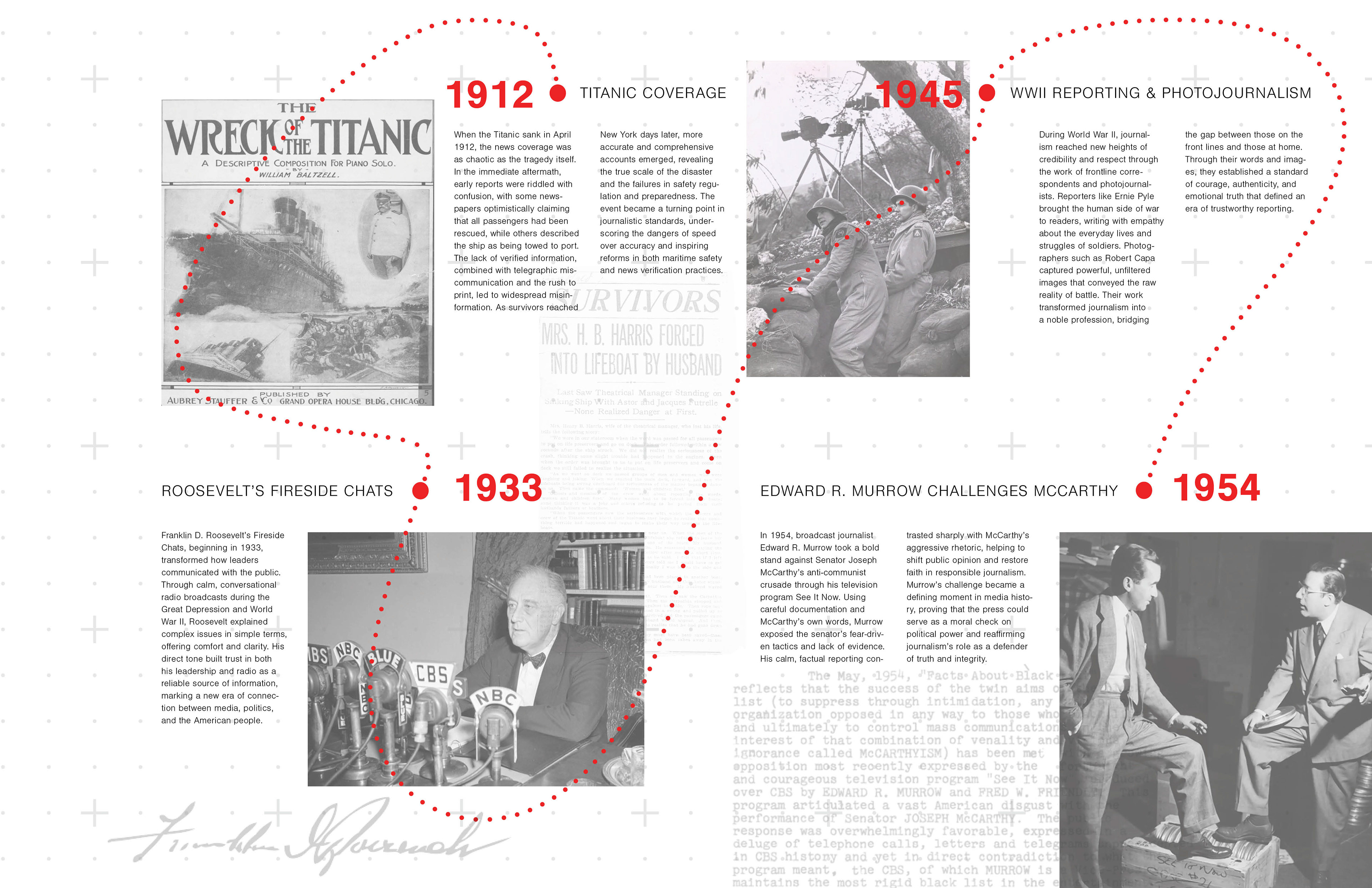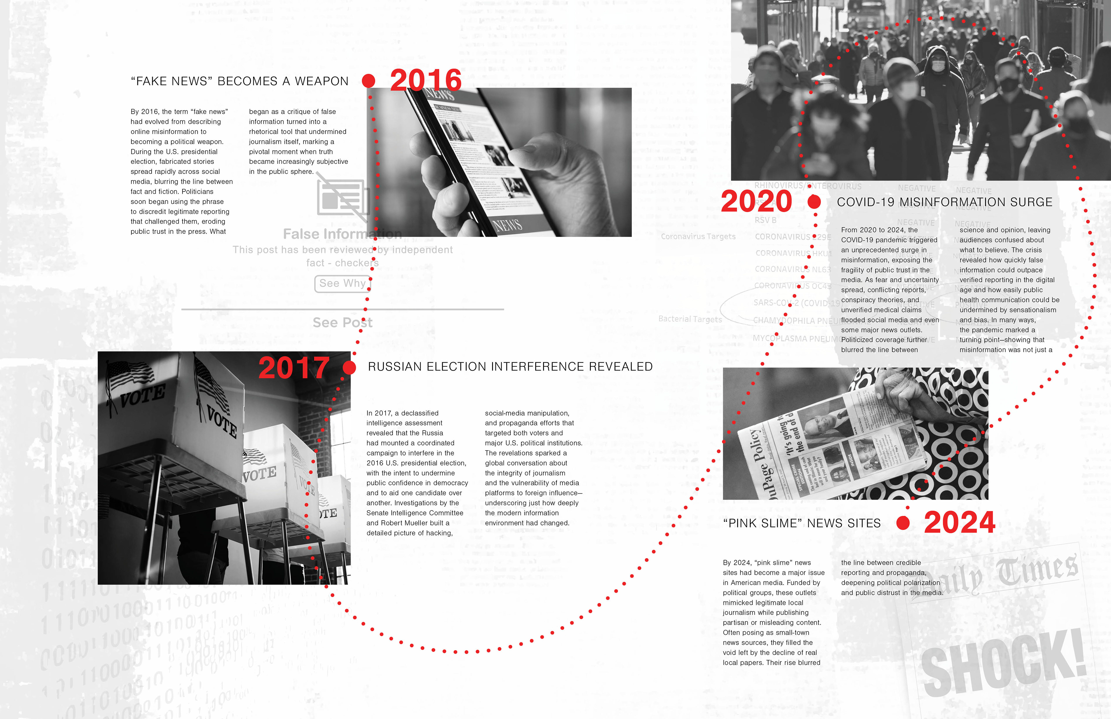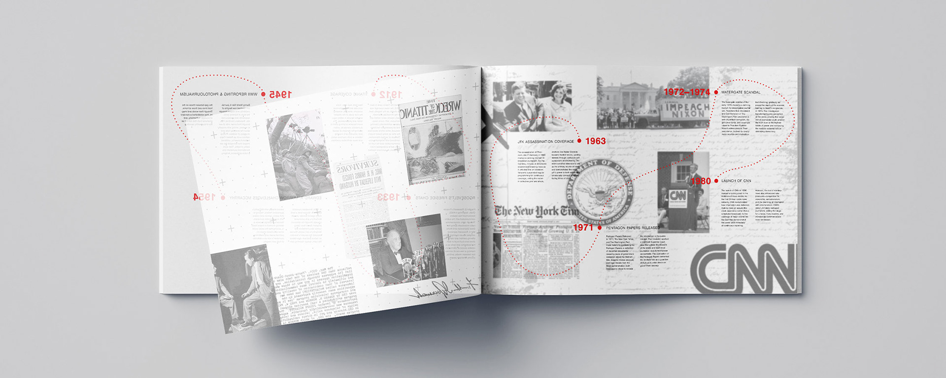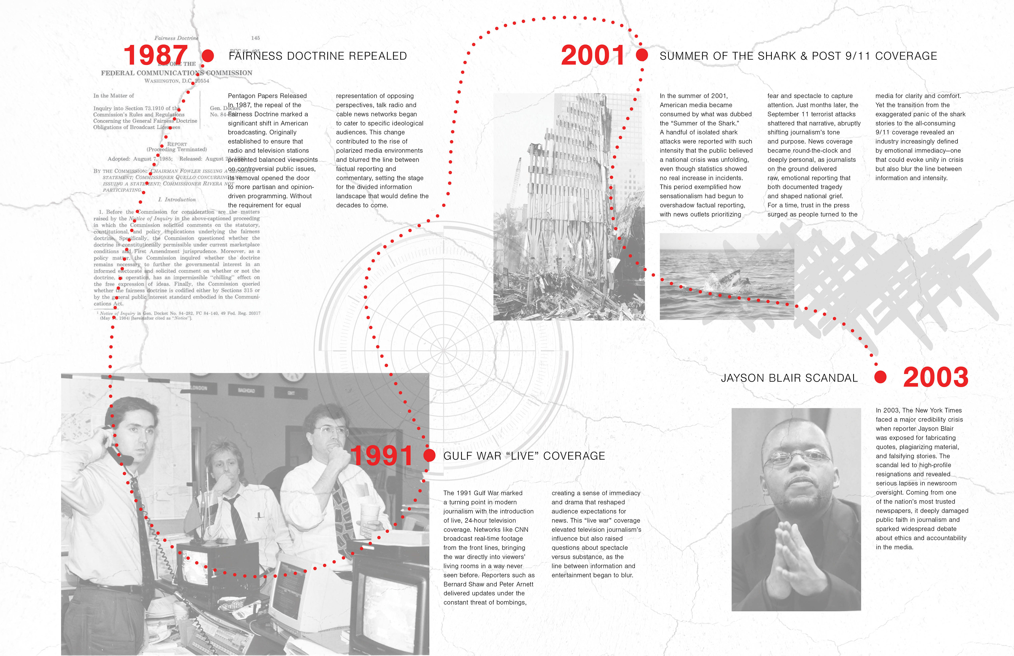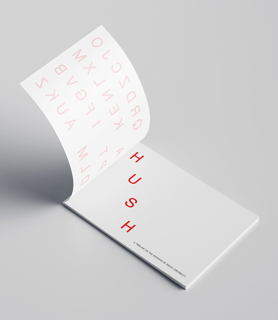 With media credibility steadily eroding over the decades, one cannot help but wonder where it all began, how journalism shifted from a noble profession into a space where writers are often driven by agenda. This project captures that decline through a timeline printed on layered sheets of vellum, transparent, fragile, and intentionally unreliable, mirroring how media, once rooted in truth, has gradually thinned into distortion. Alternating layers of imagery and timeline entries blur together, creating a visual fog where facts and context start to slip. Sharp red lines and dates cut through the otherwise black-and-white design, acting as warnings or ruptures in an increasingly fractured landscape. On the cover, scattered red letters float atop another vellum sheet, partially obscuring the hidden title, HUSH, a word that emerges only when the viewer peers through the noise. With each translucent layer, the story becomes harder to decipher, echoing the quiet creep of bias, agenda, and “fake news” that has clouded a once principled profession.